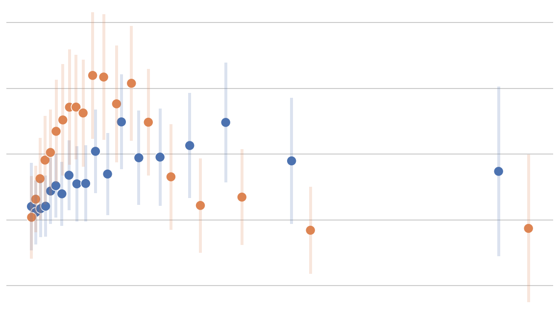 Binned scatterplots however, do not just compute conditional means, for optimally chosen intervals, but they can also provide inference for these means. In particular, we can build confidence intervals around each data point. In the binsreg package, the option ci adds confidence intervals to the estimation results. The option takes as input a tuple of parameters (p, s) and uses a piecewise polynomial of degree p with s smoothness constraints to construct the confidence intervals. By default, the confidence intervals are not included in the plot. For what concerns the choice of p and s, the package documentation reports:
